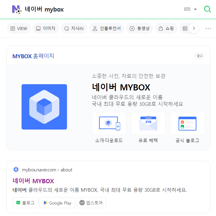 네이버 검색창에서 네이버 mybox 검색하면 아래와 같이 나오는데