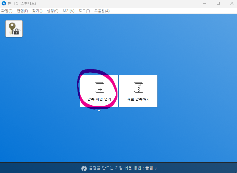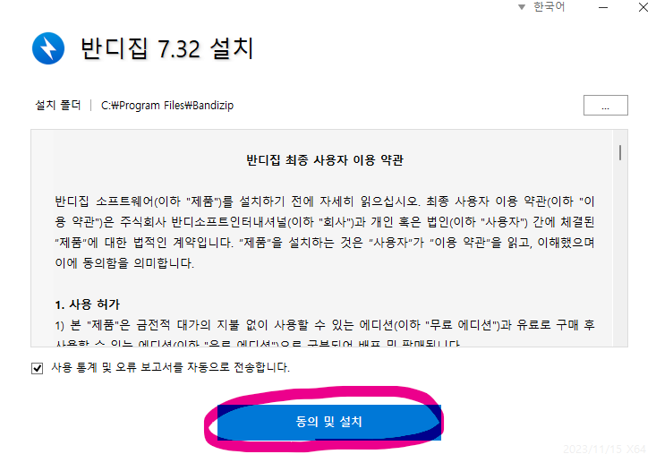 반디집을 다운로드해 주셔서 감사합니다. 이 프로그램도 사용해 보세요! 반디집 설치하기 최근 다운로드는 화면 우상단에서 확인할 수 있습니다. 설치 파일을 더블 클릭해 실행합니다. 이렇게