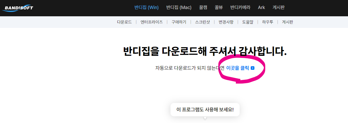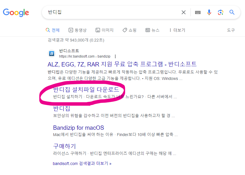 반디집을 구글에서 검색 하면 아래와 같이 반디집 설치파일 다운로드가 있어요