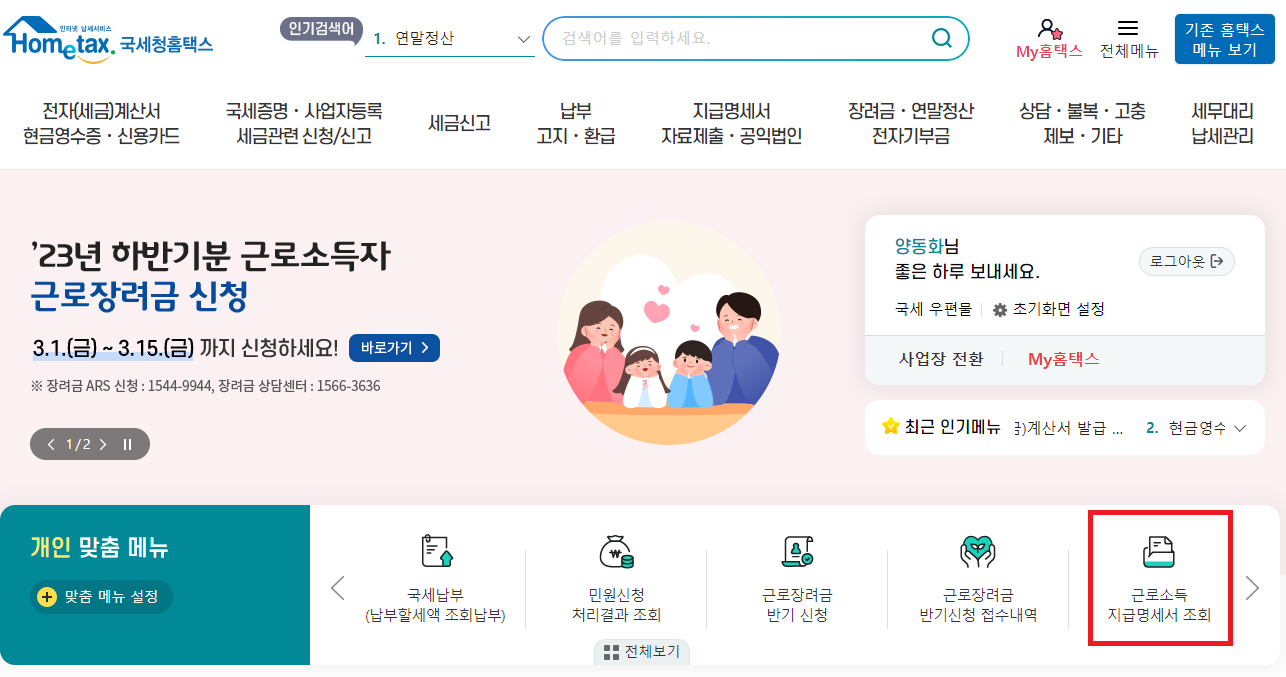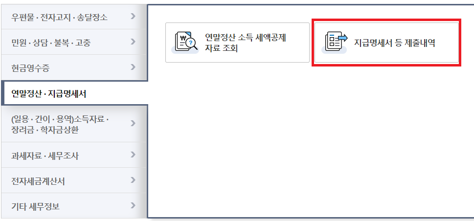 아래 화면과 같이 근로소득 지급명세서 조회라는 메뉴가 있습니다.
