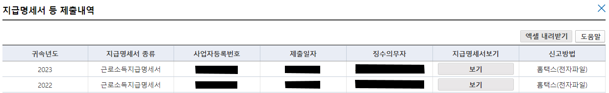보시면 본인의 근로소득지급명세서 내역이 나와요 엑셀 내려받기로 해도되고