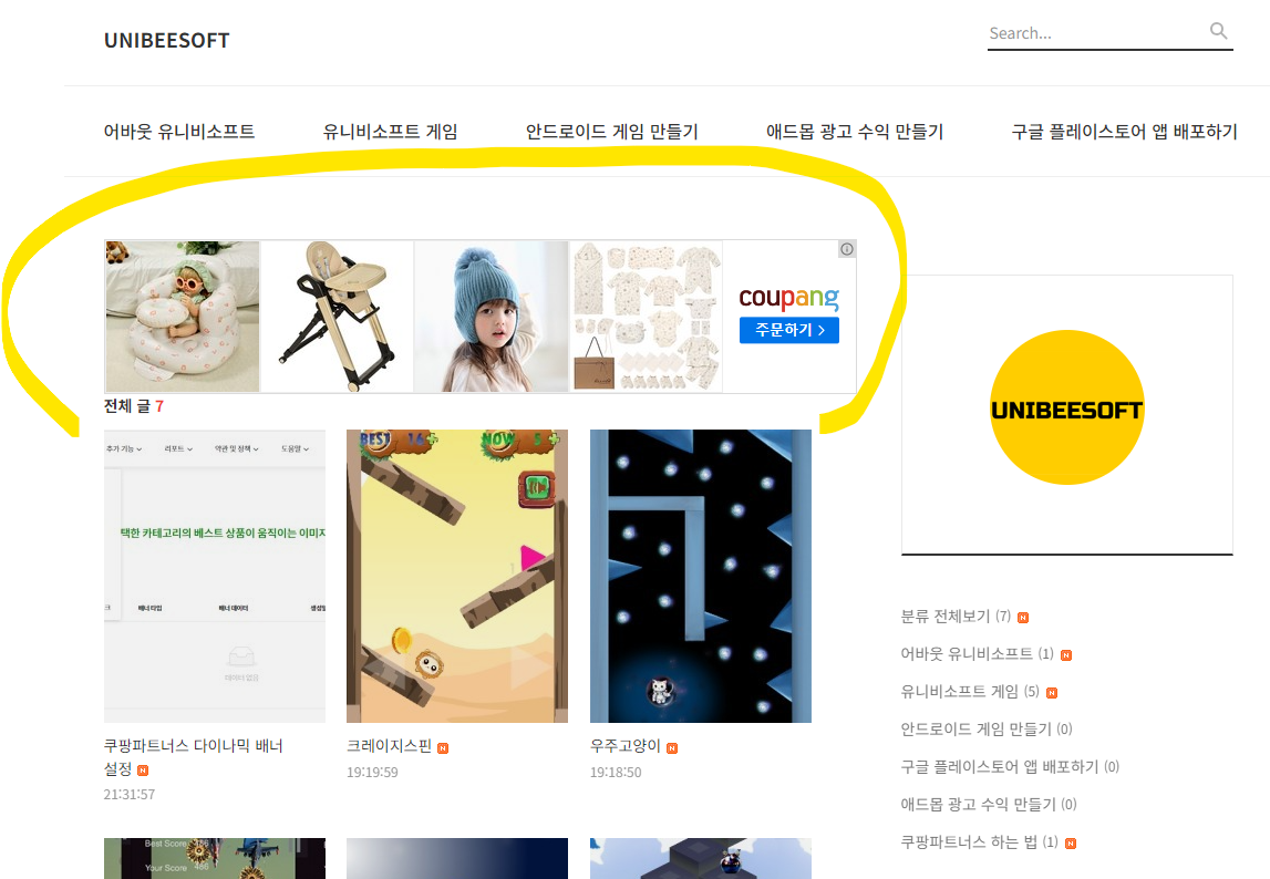 자 결과를 보겠습니다. 아래와 같이 쿠팡파트너스 다이나믹 배너가 설정되었습니다.