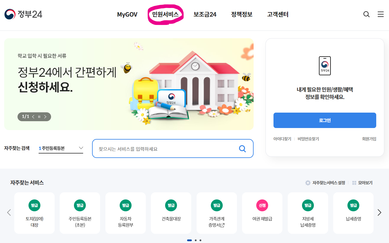살다보면 주민등록등본, 주민등록초본을제출할 일이 참 많아요.발급받을 때마다 동사무소 가기도 번거롭고 이제는 집에서 받으세요. 일단 정부24에 접속합니다.https://www.gov.kr/portal/main/nologin 정부서비스 | 정부24정부24는 정부의 민원 서비스, 정부혜택(보조금24), 정책정보/기관정보 등을 한 곳에서 한 눈에 찾을 수 있고 각 기관의 주요 서비스를 신청·조회·발급할 수 있는 대한민국 정부 대표 포털입니다www.gov.kr 접속하면 아래와 같은 화면이 나오는데민원서비스를 클릭! 민원 신청 안내 클릭!오호 요즘은 영문도 바로 발급되나봐요.주민등록표 등본 또는 주민등록표 초본 본인에 맞는 걸로 발급하기 버튼 클릭! 발급대상자 선택 후주민등록상 주소 선택 등 정보에 맞게 기입하고 ..